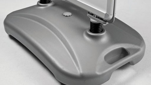 Exteriérový poutač se stabilní konstrukcí v moderní designu se zakulacenými rohy. Poutač je posazen do plastové základny o objemu 32 litrů vody nebo 59 kg písku.