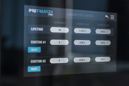 Nastavit všechny funkce Vám dovolí 7” barevný dotykový displej. Automatizujte svůj pracovní postup s 5 předvolenými možnostmi a 10 vlastními předvolbami. Jako volitelná funkce je také možnost „načtení čárového kódu“ pro bezchybný tok výroby. Další funkce automatizace umožňuje ukládat oblast postřiku a množství kapaliny, kterou používáte. Kalkulačky úloh a spotřeby kapaliny vám přesně sdělí náklady, které potřebujete vědět. Celý systém vás průběžně informuje o stavu kapalin, popřípadě o krocích, které provádíte, aby se zabránilo chybám ve výrobě.