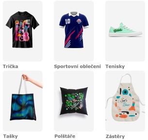 tričká a polo tričká, pracovné odevy a uniformy, športové oblečenie, zásterky, tašky a doplnky, vankúše a bytový textil, tenisky a obuv.